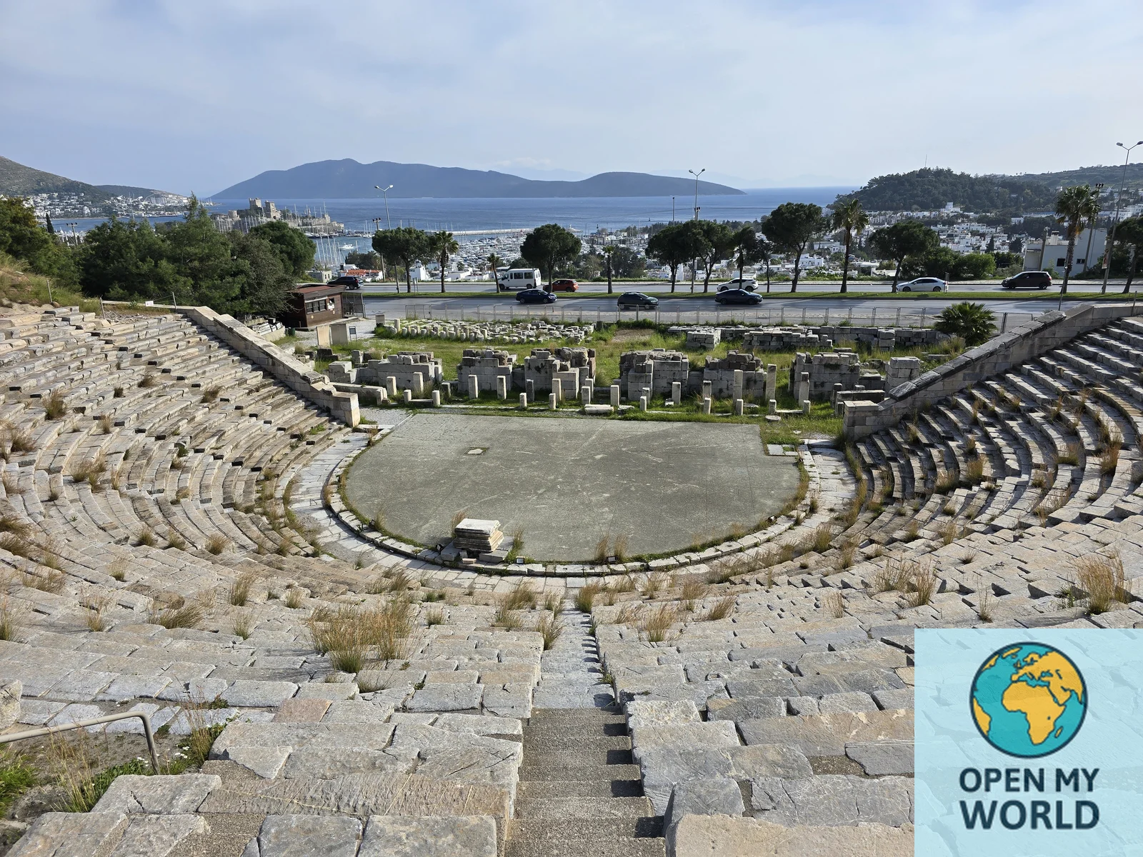 - Театр расположен на склоне холма Гёктепе, откуда открывается панорамный вид на Бодрум, море и остров Кос.