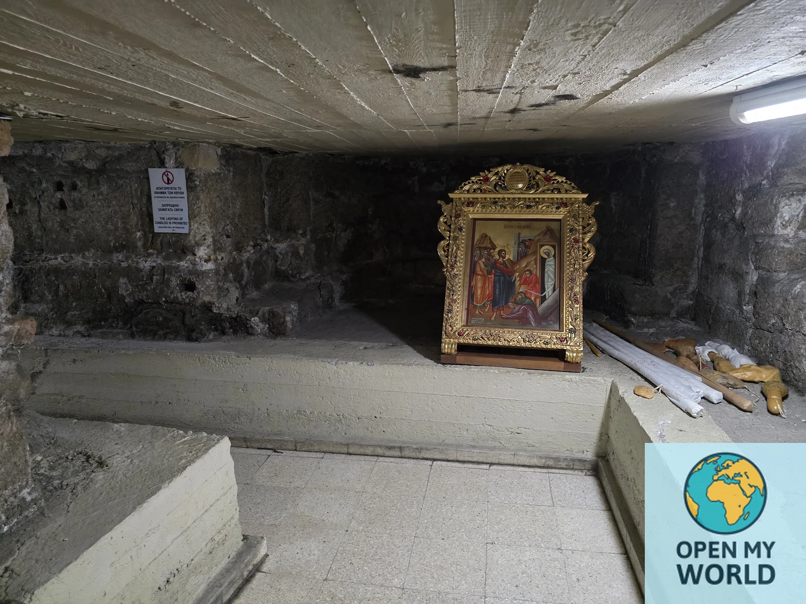 Под алтарной частью, в небольшом каменном помещении, куда ведёт узкая лестница.