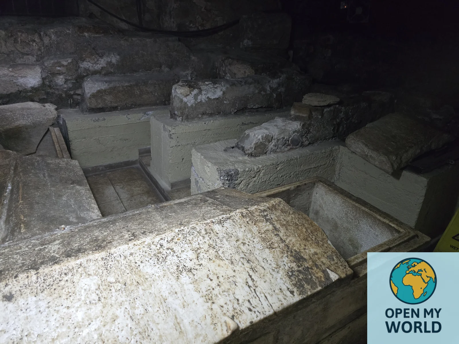 Саркофаг стоит на каменном основании, а стены сохранили следы древней кладки.